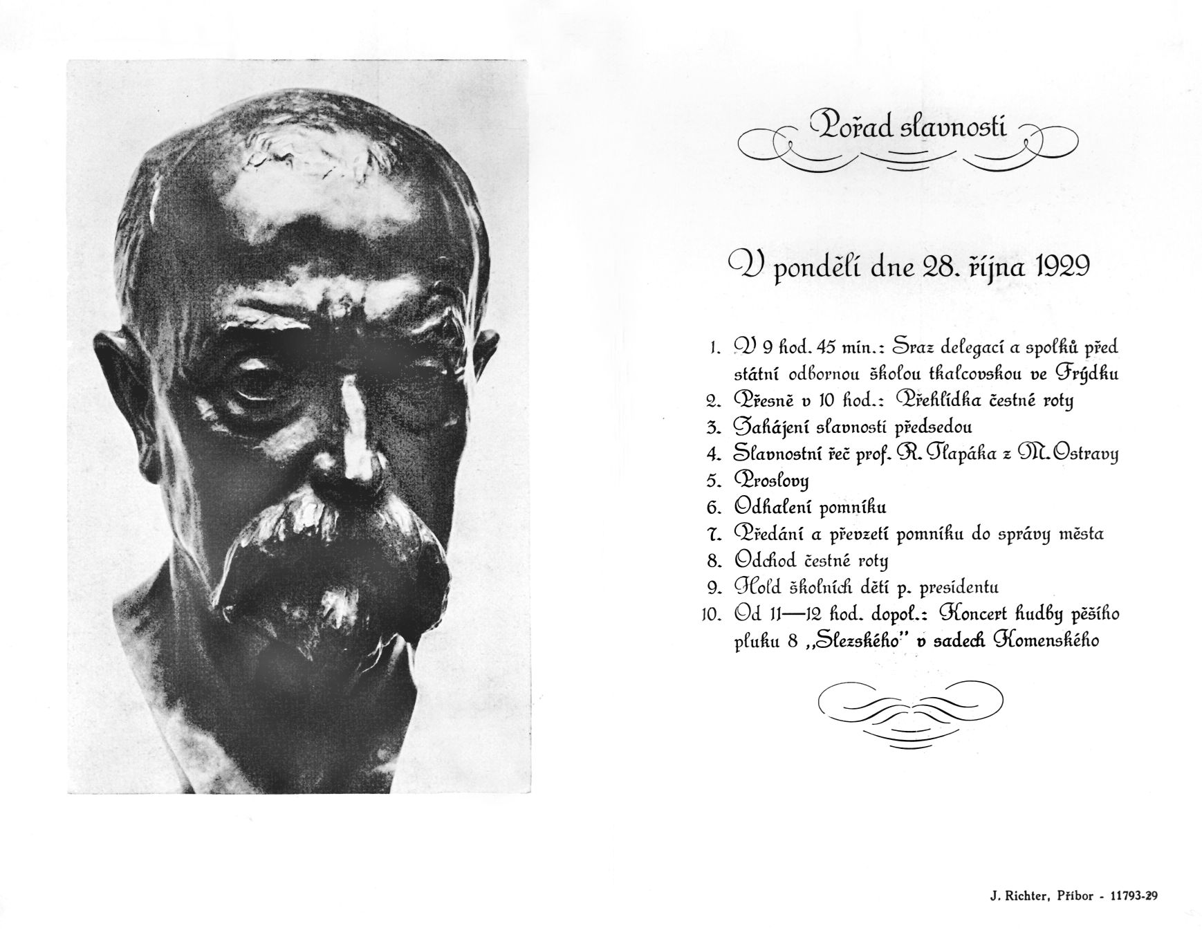 „Již po 9. hodině ráno hrnuly se zástupy lidu ze všech ulic města Frýdku i z Místku a blízkého okolí na Wilsonovu třídu, kde stojí pomník. Ve tři čtvrti na 10 hod dostavilo se vojsko, přišli zástupci úřadů a korporací, spolky a školní děti. Přesně v 10 hod zahájil předseda spolku pro postavení pomníku vzletným proslovem slavnost, načež starosta města Frýdku (dr. Dokulil) uvítal přítomné a pronesl řeč, v níž naznačil význam pomníku pro naše město. Slavnostní řečník (prof. Tlapák z Moravské Ostravy) pak nadšenými slovy promluvil o panu prezidentu Masarykovi a o jeho osvobozeneckém díle. Všichni přítomní vyslechli řeč s hlubokým dojmem. Okresní hejtman (dr. Cichra), jednatel spolku a brigádní generál (Slunečko) stručně, ale jadrně projevili radost nad postavením pomníku v našem městě. Vznešený byl dojem při odhalení pomníku. Tak mnohé oko se zarosilo. Podobné chvíle zažije člověk jen zřídkakdy ve svém životě, a proto zůstanou dlouho v dobré paměti. Starosta potom převzal pomník do správy města. Vojsko vzdalo pomníku čest a vojenská hudba zahrála fanfáry a národní hymny. Nakonec defilovalo vojsko před pomníkem a hodnostáři, po nich spolky a školní děti. Po rozchodu koncertovala vojenská hudba v protějším parku Komenského, při čemž mnoho lidí přispělo různými obnosy na úhradu zbytku nákladu na pomník. Účast obecenstva byla imposantní a to nejen z obou měst, ale i z blízkého okolí. Frýdek nezažil nic podobného od převratu.“ (Frýdecko-místecký kraj, 2. listopadu 1929)